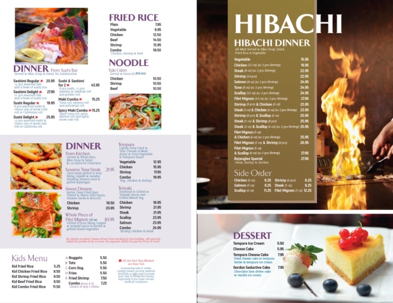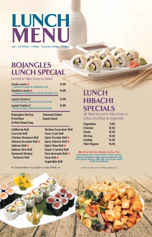With a variety of beverages, side orders, and extra sauces like Teriyaki Sauce and Spicy Mayo, Bojangles Sushi ensures there's something for everyone. Whether you're stopping by for lunch with the Lunch Combo or enjoying a hearty Hibachi Dinner, this restaurant provides a satisfying dining experience for all occasions.