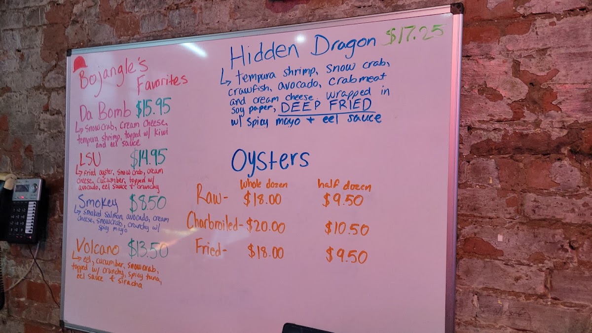 For sushi lovers, Bojangles offers a variety of Nigiri or Sashimi options, including Crab Stick, Eel, and Flying Fish Roe. The Dinner From Sushi Bar section features crowd-pleasers like Sashimi Delight and Sushi & Sashimi For 2, perfect for sharing or indulging in a bigger feast. The Deep Fried Rolls, such as the signature Bojangles Roll and the Golden Dynamite Roll, provide a crispy and flavorful experience, while the Baked Rolls, like the Baked Salmon Roll and Mt. Fuji Roll, offer a warm and satisfying twist on classic sushi.